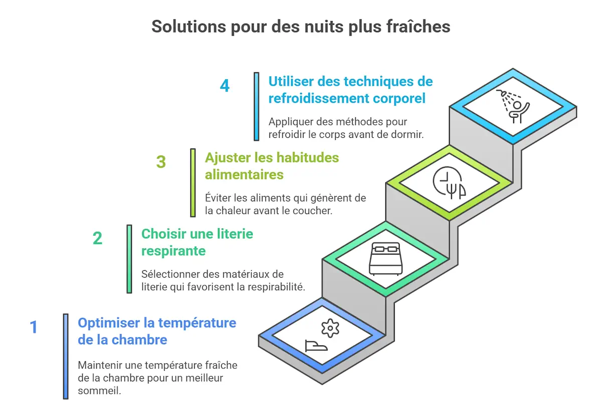 Les techniques de refroidissement corporel peuvent procurer un soulagement immédiat. Prenez une douche tiède avant le coucher, humidifiez les points de pulsation (poignets, nuque, chevilles) avec un gant frais. Gardez une bouteille d’eau fraîche à portée de main pour vous hydrater si nécessaire durant la nuit.