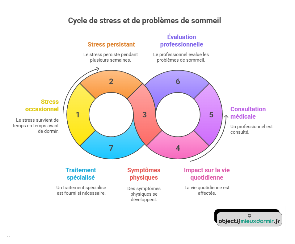 Si votre stress avant de dormir persiste depuis plusieurs semaines, s’accompagne de symptômes physiques (palpitations, tensions musculaires, troubles digestifs) ou impacte significativement votre vie quotidienne, n’hésitez pas à consulter votre médecin.